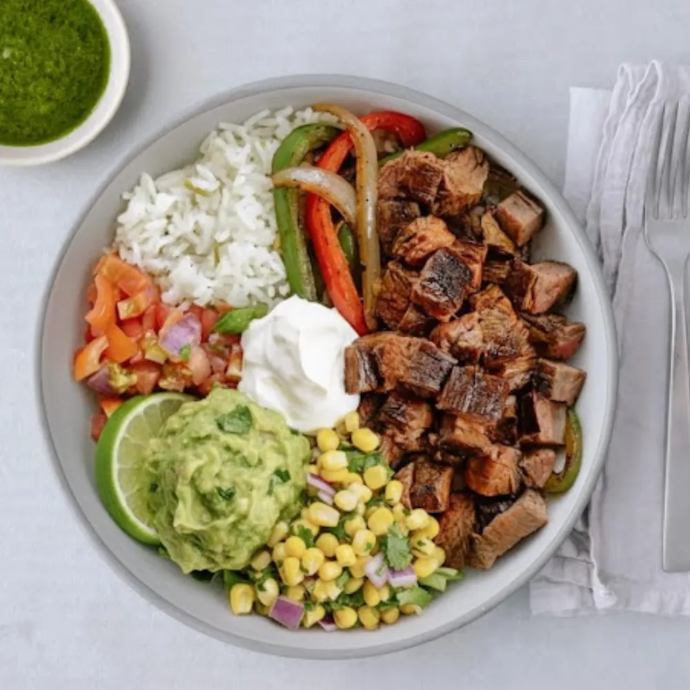 1/4LB of pasture-raised protein, organic rice, organic fajita veggies, organic corn salsa, grass-fed & pasture-raised cheese, organic tomatoes, housemade organic salsa verde, organic grass-fed chipotle crema, and sprinkled with organic cilantro