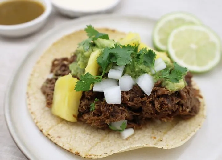 3 large organic corn tortillas, with greater than 1/4LB of 100% grass-fed & pasture-raised slow roasted beef barbacoa, housemade guacamole, housemade organic salsa verde, organic grass-fed chipotle crema, and organic pineapple pico de gallo