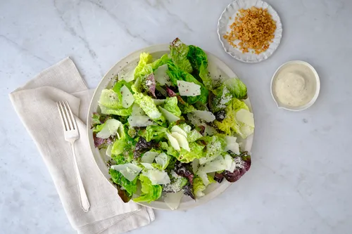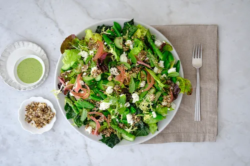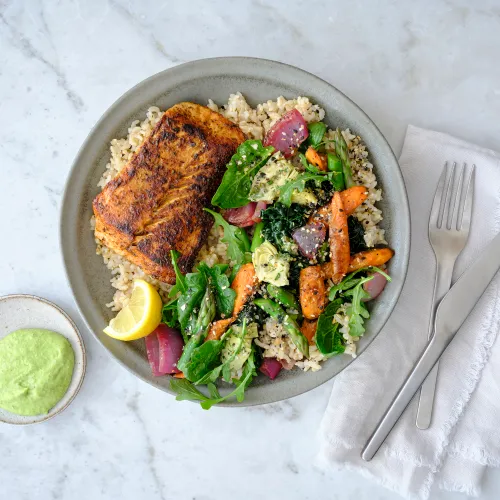Pan-seared salmon seasoned with our GCC blackening spices, with organic brown rice and quinoa blend, arugula and spinach salad, and topped with cucumber and snap peas that comes pre-tossed with our GCC Green Goddess dressing and everything bagel seasoning, roasted cherry tomatoes, pickled onions, and avocado, served with a side of our GCC non-dairy ranch dressing. gluten-free and dairy-free